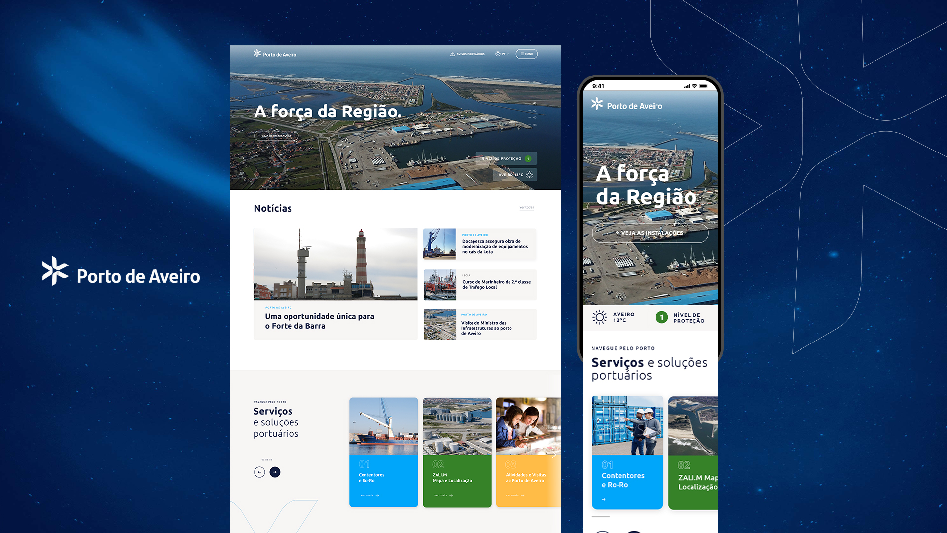 Em www.portodeaveiro.pt encontrará tudo sobre esta instituição centenária. Com a assinatura "sustentabilidade, crescimento e inovação", neste website, de navegação intuitiva, pode visitar o Porto de Aveiro de fio a pavio, conhecer os seus serviços e soluções portuárias, ler notícias e aceder a toda a informação especializada. Um layout totalmente alinhado com a linha gráfica do rebrand premiado da marca, que também foi desenvolvido por nós.